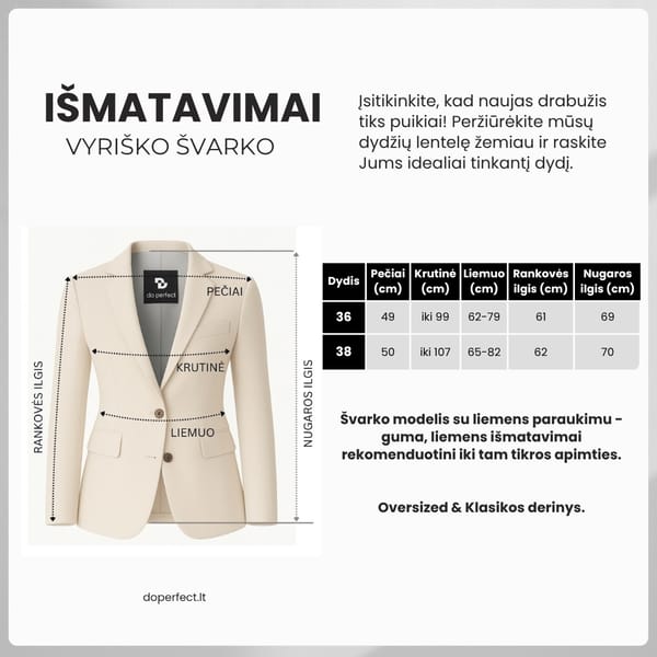 Šis švarkas puikiai dera tiek prie kasdienio, tiek prie šventinio garderobo, todėl pravers įvairiomis progomis.